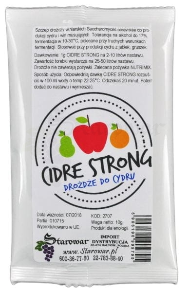 Odpowiednią dawkę drożdży CIDRE STRONG należy wymieszać w 100ml wody o temperaturze 22-25 °C. Odczekać 20 minut. Po tym czasie dodać do moszczu i wymieszać.