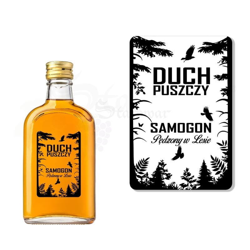 Transparentna etykieta z mocnym, leśnym charakterem. Czarne, kontrastowe grafiki drzew, ptaków i roślin tworzą klimatyczną ramkę wokół tekstu „DUCH PUSZCZY” oraz „Samogon – Pędzony w Lesie”. Projekt idealnie oddaje dziki, naturalny klimat domowego trunku.