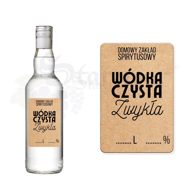 - Design: Napis „Domowy Zakład Spirytusowy” oraz duże litery „Wódka Czysta Zwykła” w efektownym stylu retro.