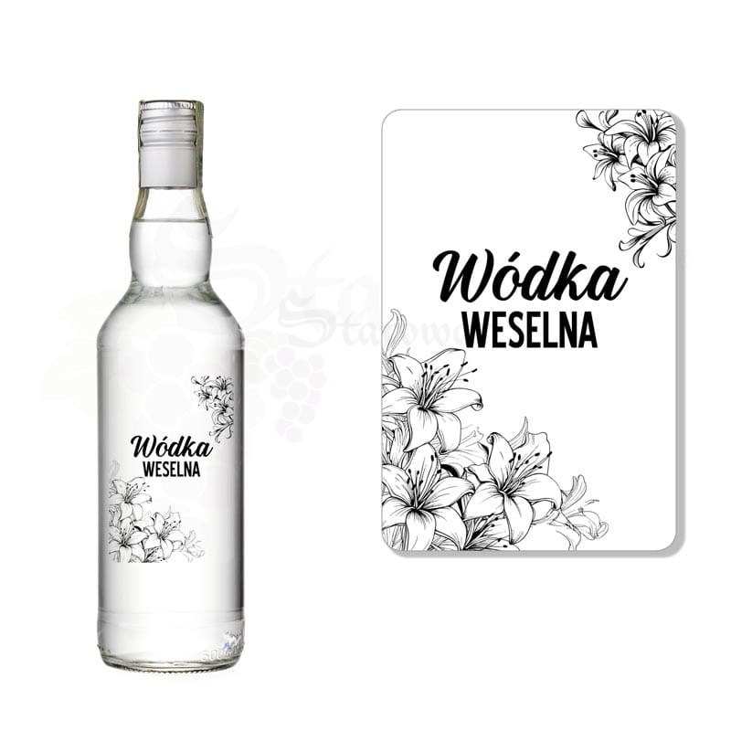 Nowoczesna i subtelna etykieta na wódkę weselną w wersji transparentnej. Czarna grafika z ozdobnym napisem „Wódka Weselna” oraz delikatnym kwiatowym motywem sprawia, że butelka nabiera klasy i elegancji. Dzięki przezroczystemu tłu, etykieta doskonale komponuje się ze szkłem i kolorem trunku.
