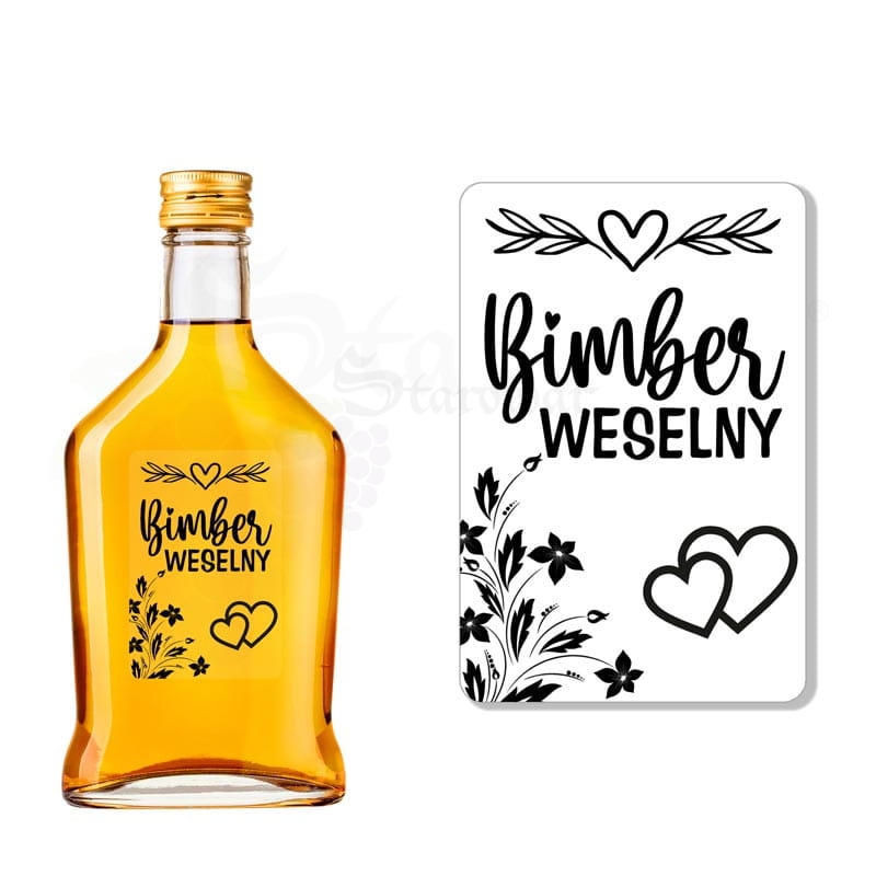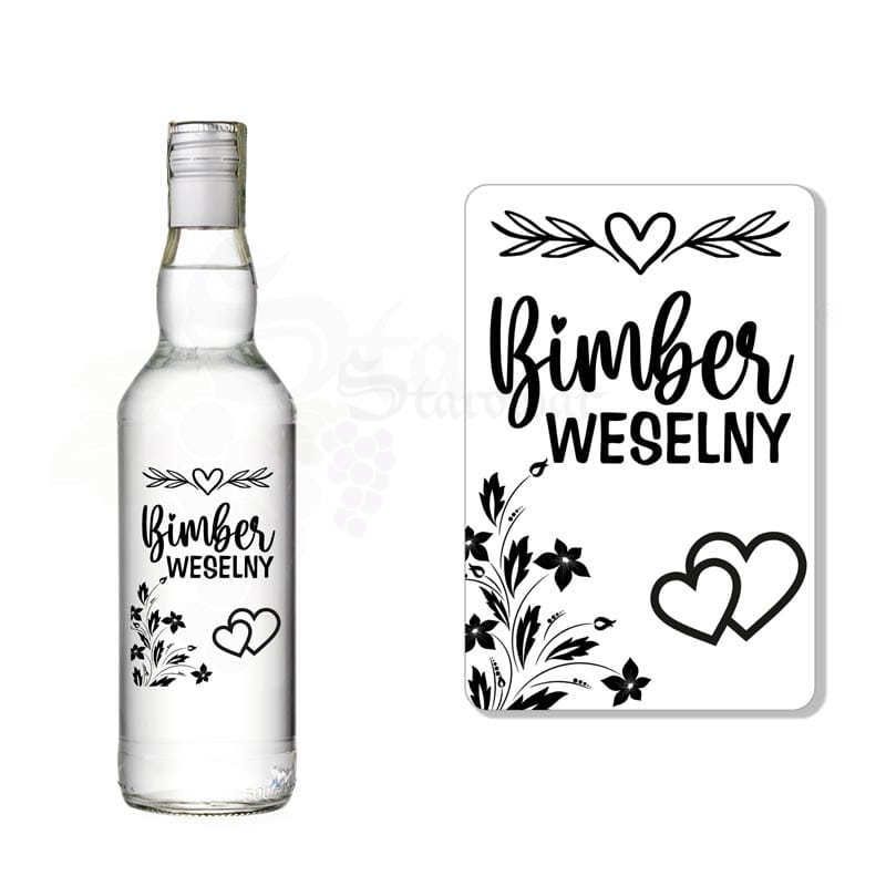 Zabawna i stylowa etykieta transparentna przeznaczona na butelki z bimbrem weselnym. Dekoracyjny napis, serca i kwiatowe akcenty tworzą lekki, rustykalno-romantyczny klimat, idealny na wesele z przymrużeniem oka.