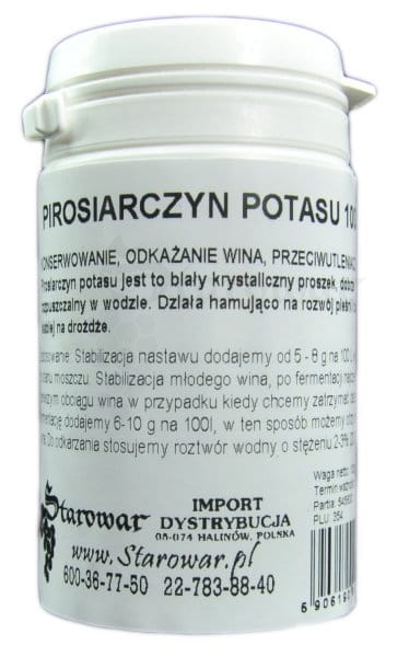 Pirosiarczyn potasu jest to nieorganiczny związek chemiczny, który przybiera formę białego krystalicznego proszku. Dobrze rozpuszcza się w wodzie i etanolu. Pirosiarczyn potasu jest powszechnie stosowanym do stabilizacji moszczów, aby zabezpieczyć przed rozwojem bakterii i dzikich drożdży podczas fermentacji oraz win, aby zatrzymać fermentację, zabezpieczyć przed utlenianiem, ustabilizować barwę oraz klarowność.