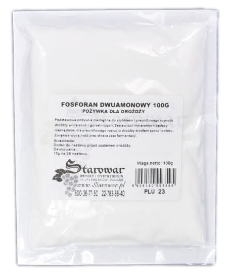 Skład pożywki Fosforanu Dwuamonowego zawiera zestaw soli mineralnych, który jest niezbędnym składnikiem do prawidłowego rozwoju drożdży - źródło azotu i potasu.