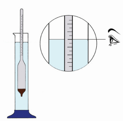 Szklaną menzurkę (wysoką przezroczystą szklankę, próbówkę) o wysokości minimum 25 cm należy wypełnić alkoholem (wódka, spirytus, bimber) bez substancji słodzących. Delikatnie zanurzyć wskaźnik, aby nie dotykał dna oraz ścianek menzurki. Po ustaniu wskaźnika, można dokonać odczytu % alkoholu. "Lustro cieczy" przedstawi pomiar. Odczyt dolny, przy którym głębokość zanurzenia wyznacza płaszczyzna swobodnej powierzchni cieczy. |