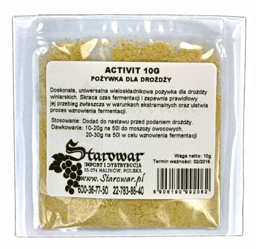 Pożywka dla drożdży ACTIVIT ogranicza możliwości deficytu przyswajalnych źródeł azotu i witamin, które w środkowej części fermentacji są bliskie wyczerpania. Odtruwa środowisko, wiążąc substancje hamujące proces fermentacji, takie jak średnio cząsteczkowe kwasy tłuszczowe lub pozostałości środków chemicznych zawarte w moszczu.